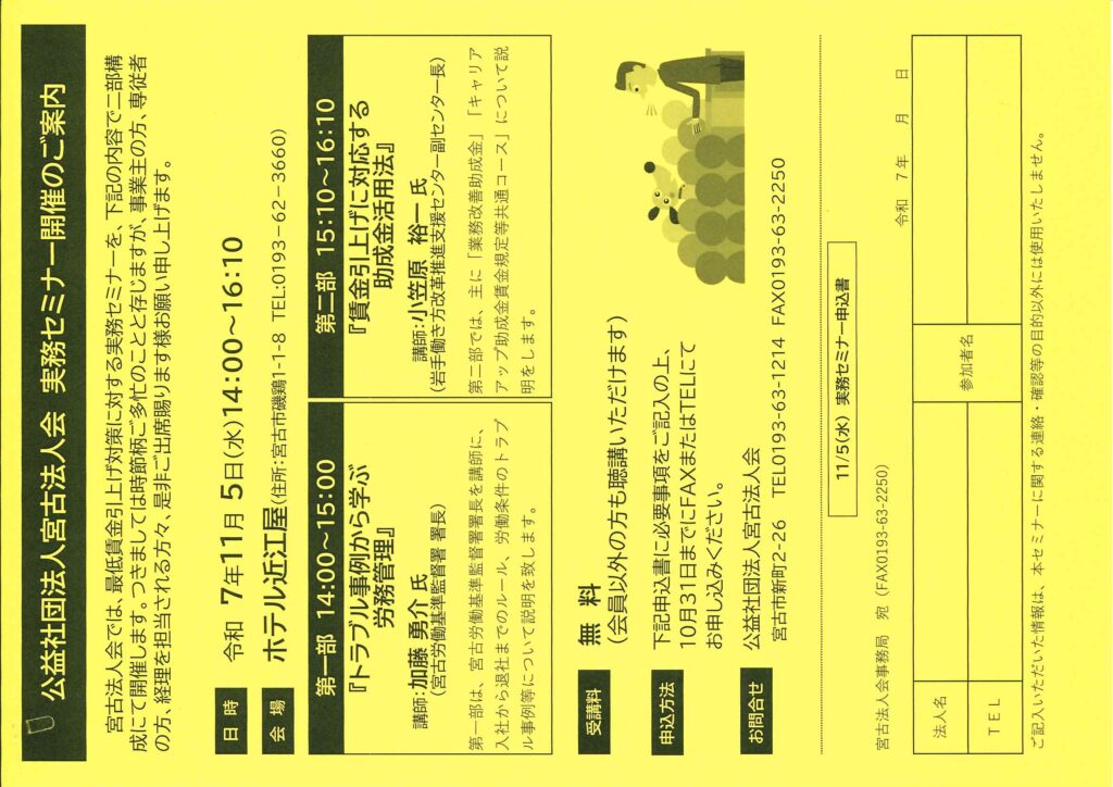宮古法人会では、最低賃金引き上げに対する実務セミナーを、二部構成にて開催します。会員以外の方も聴講可能ですので、ご参加ください。
