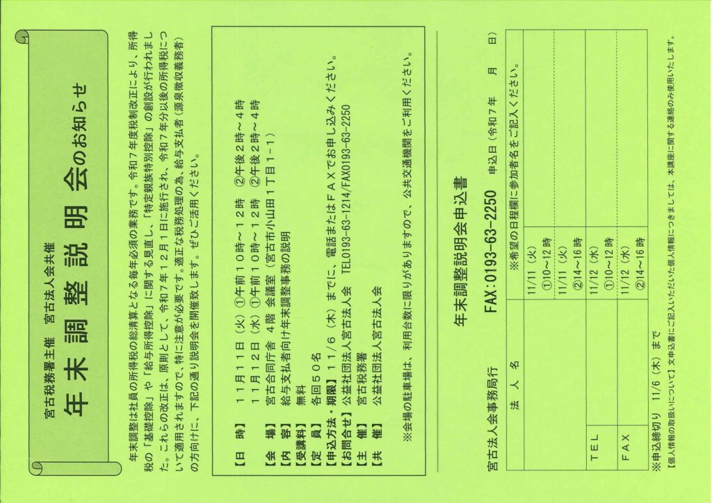 宮古法人会では、宮古税務署と共催にて、年末調整説明会を開催します。